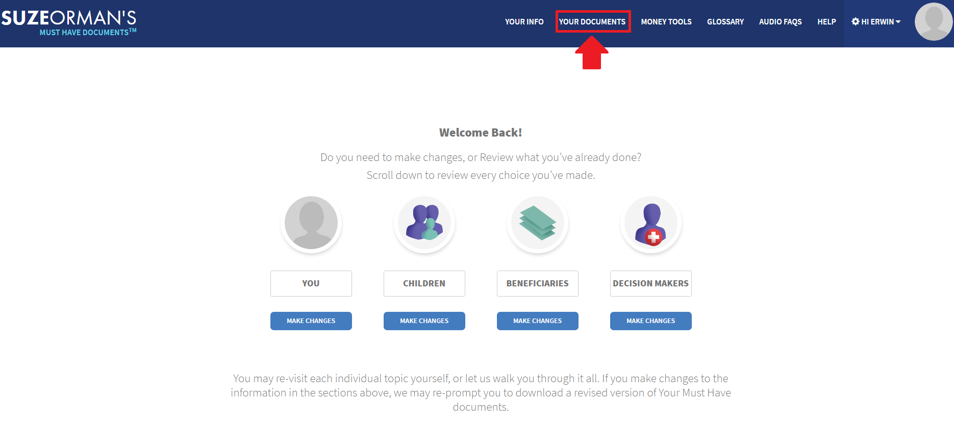1) Click on Your Documents in the top tool bar of the program. If you see Continue in it's place that means you're not done and need to continue filling in the required fields before you can print the documents.